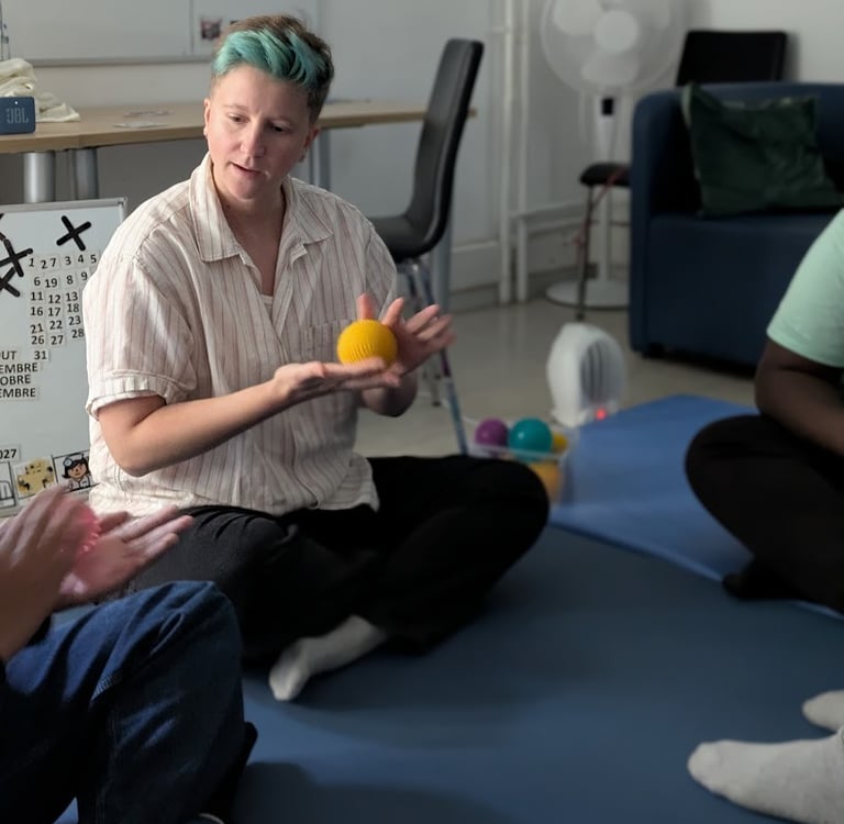 Dans ma pratique actuelle en structure auprès de jeunes adultes ayant un Trouble du Spectre Autistique associé à handicap mental, je mène des prises en charge individuelles et groupales pour favoriser leur bien-être global : psychique, corporel, émotionnel et sensoriel.